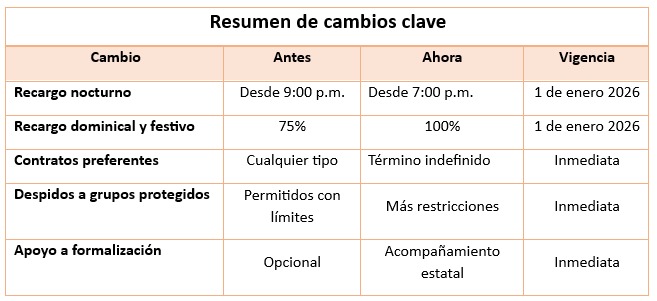 El recargo nocturno ahora inicia desde las 7:00 p.m. (antes era a partir de las 9:00 p.m.). También se aumentan los recargos por trabajo dominical y festivo.